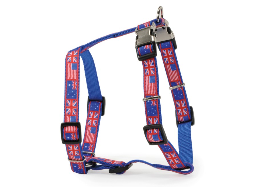 Adjustable dog harness with two buckles, featuring the particular pattern with flags.