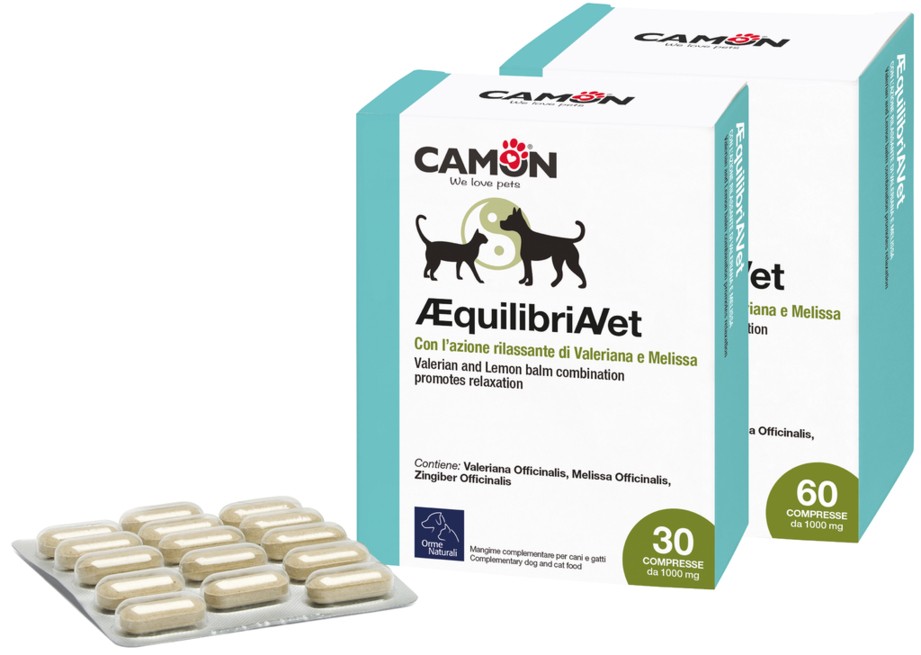 AEquilibriAVet is a complementary food with lemon balm, valerian, ginger and tryphtofan. Lemon balm and valerian have a calming effect but without being real sedatives. The ginger soothes digestive problems such as nausea and vomit. It enhances the digestion.