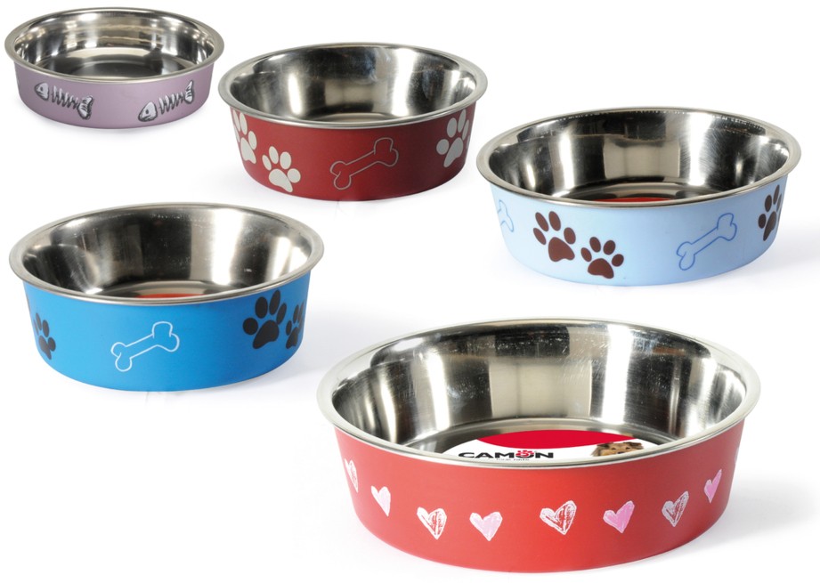 Deep steel bowls with plastic outer dish and non-slip O-ring.
