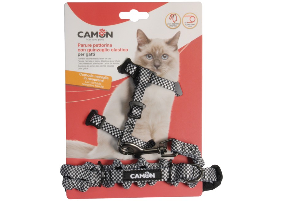 Elegant adjustable H-shaped polyester harness for cats, equipped with an elastic leash and a comfortable neoprene handle.
