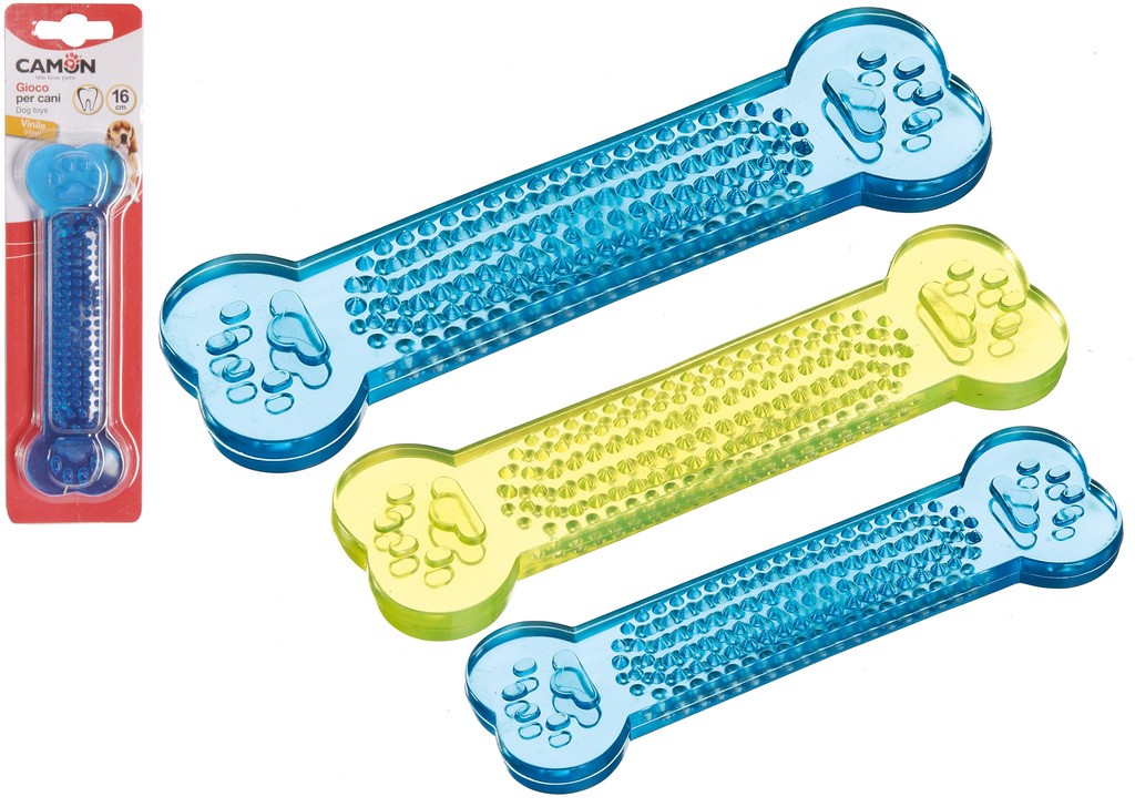 Made of colourful vinyl, with an irregular surface that massages teeth and gums.