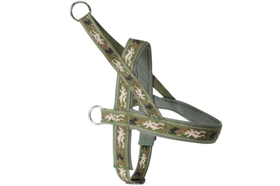 Neoprene harness available in seven different sizes and in different patterns and colors.