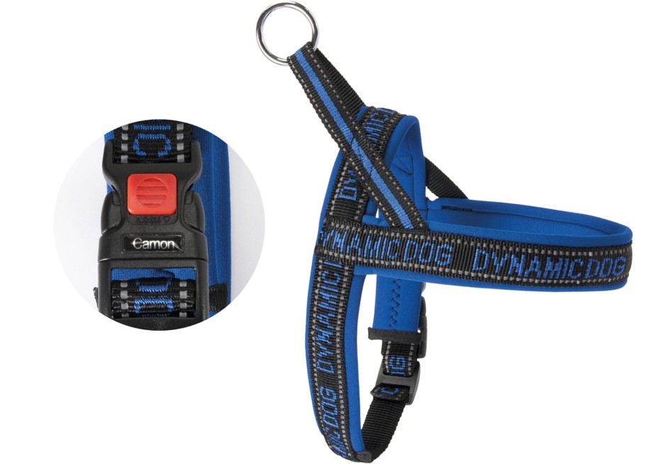 Neoprene harness. Available in seven sizes and in different colours and patterns.