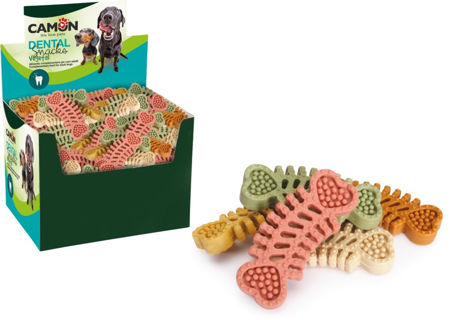 Delicious vegetal snacks in the shape of a fishbone, a chewable complementary food for dogs, very useful also for dental cleaning.