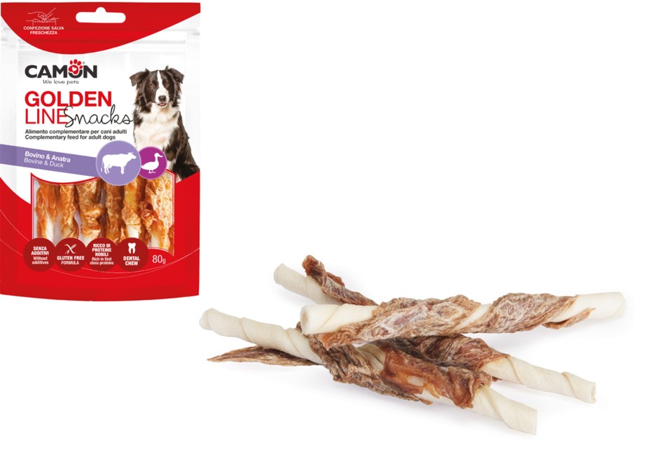 Rawhide rolls with duck breast, chewable complementary feed for adult dogs.