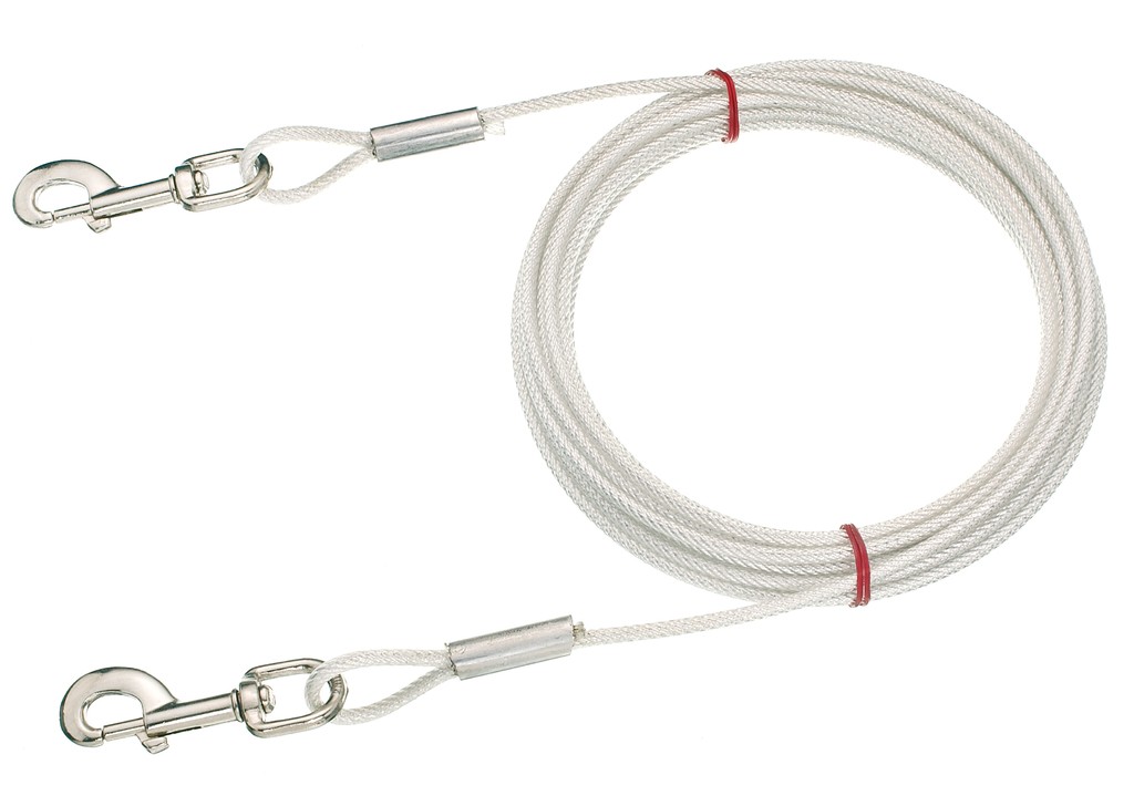 This cable features a vinyl-coated galvanized steel wire cable with heavy-duty easy-release, tangle resistant swivel snaps.
