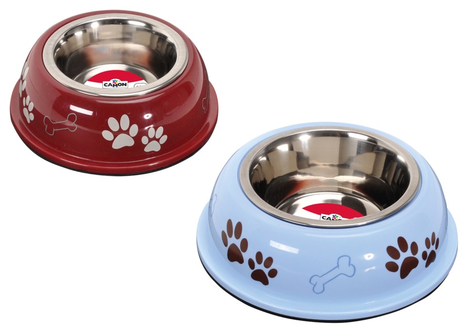Ciotola in acciaio inserita in un rivestimento in plastica, dalla forma un po' bombata, colorata e decorata.