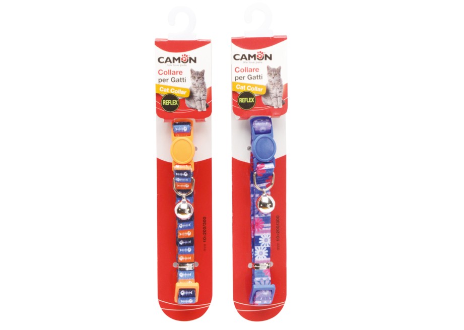 Grazioso collare per gatti, caratterizzato dagli inserti reflex, dal sistema di sgancio di sicurezza e da un doppio campanellino.