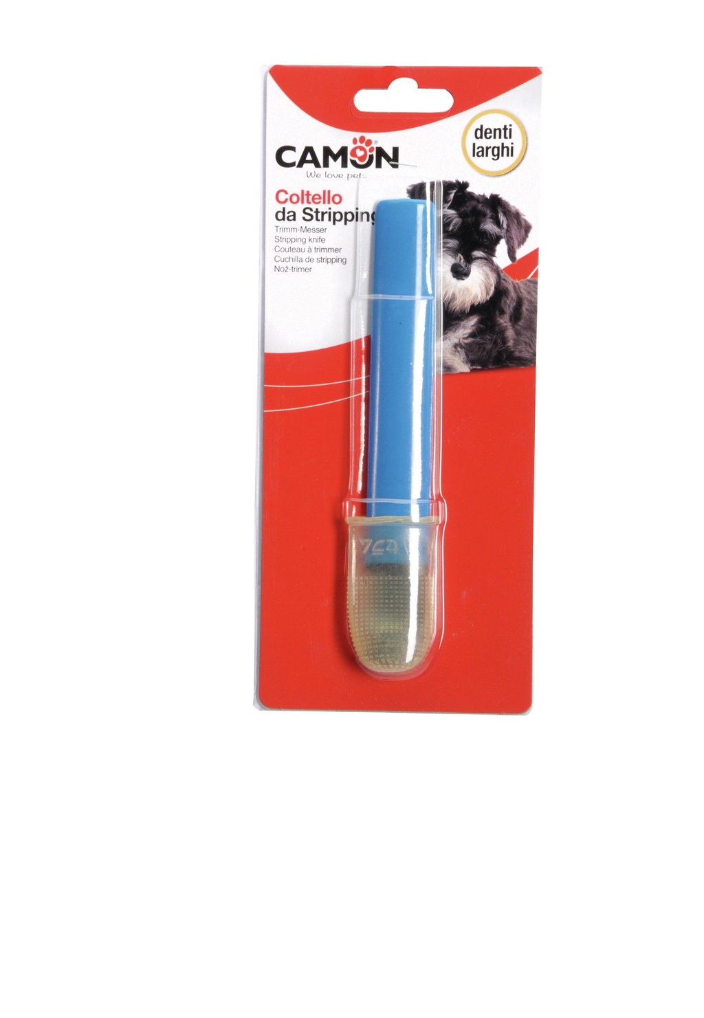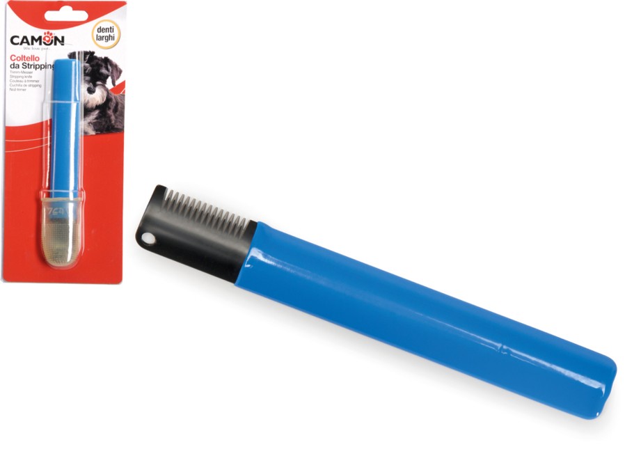 Coltello da stripping professionale: i denti larghi sono ideali per rimuovere il pelo morto e sfoltire il manto, mantenendolo sano e ordinato su schiena e parti inferiori dell’animale.