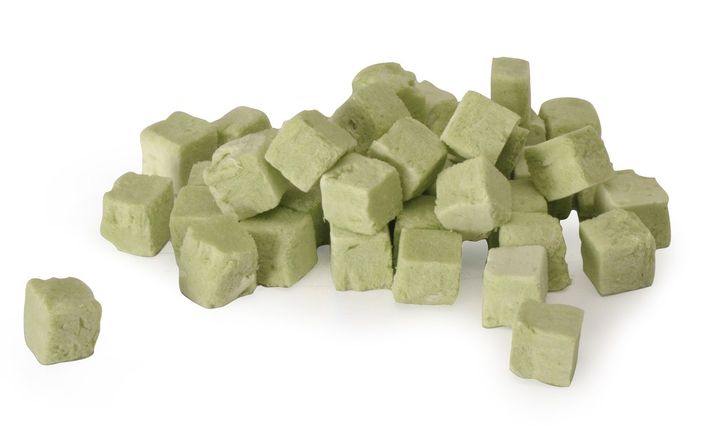 Dadini di pollo liofilizzati al gusto di erba gatta, uno sfizioso alimento complementare per gatti adulti.