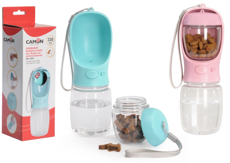 DRINK&EAT - Bottiglia portatile per l’acqua con portaricompense per cani