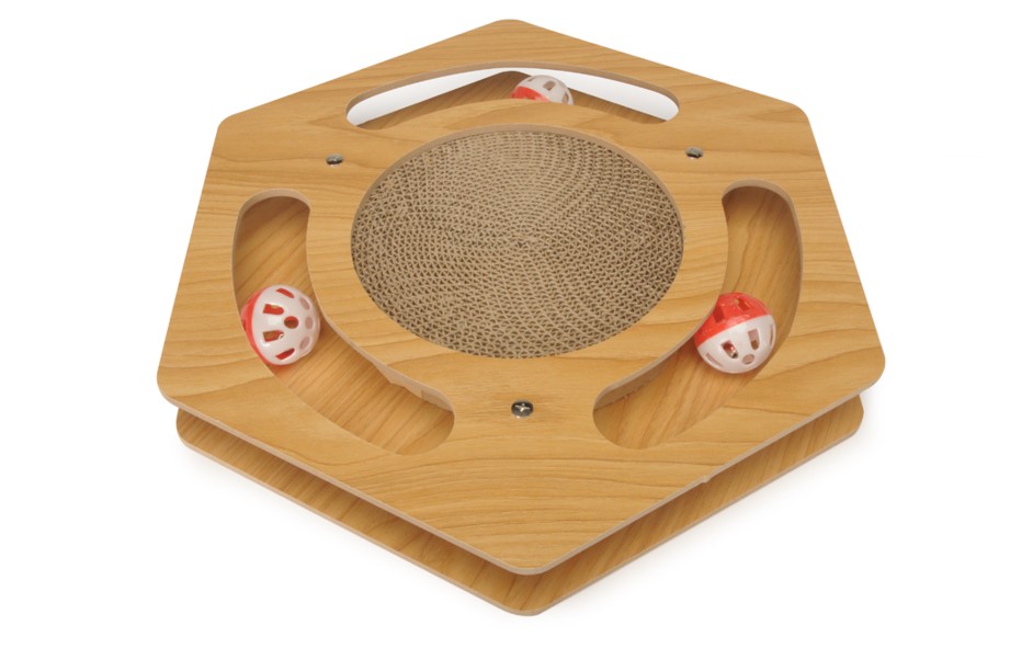 Divertente tiragraffi in cartone, di forma esagonale, pensato per il passatempo del gatto.