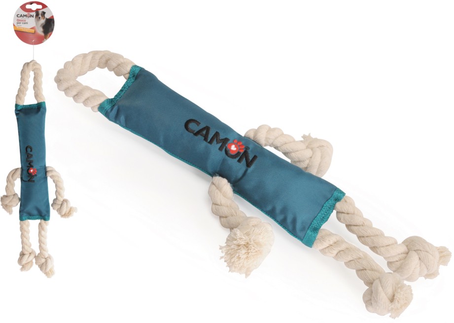 Divertente gioco per cani nella forma di un riportino dalle sembianze di essere umano stilizzato, con corda in cotone.