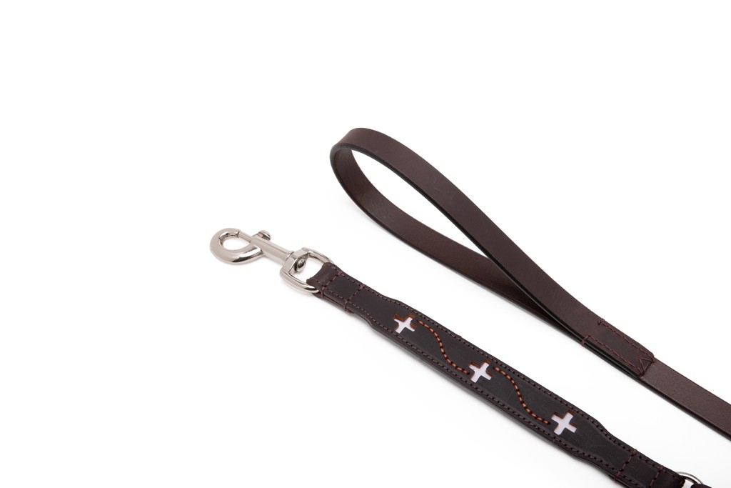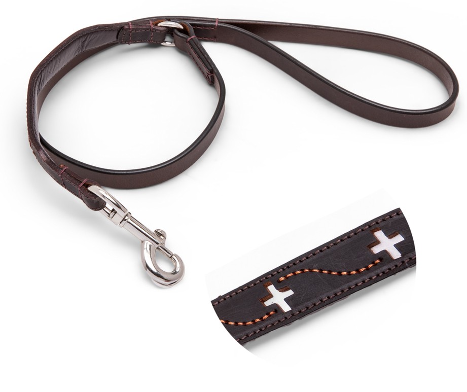 Elegante guinzaglio in vera pelle caratterizzato dal motivo a fantasia svizzero.