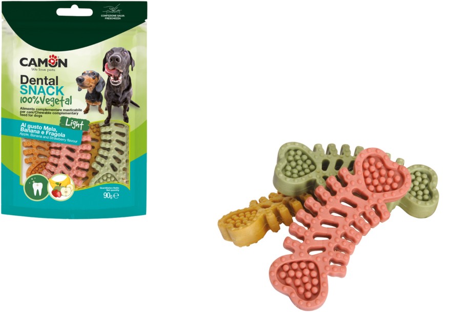 Sfiziosi snack vegetali a forma di lisca di pesce, un alimento complementare masticabile per cani, molto utili anche per la pulizia dentale.