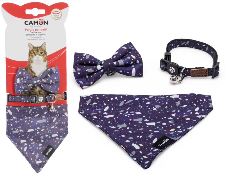 Elegante parure per gatti composta da un collare regolabile con bandana e papillon.