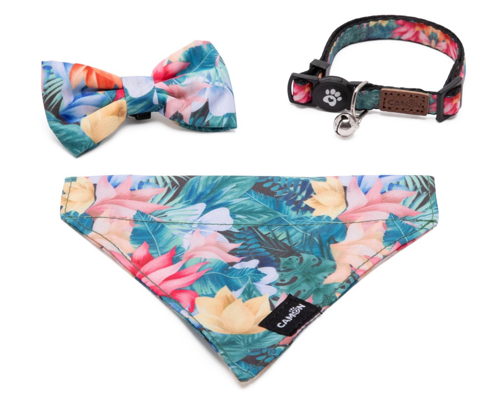 Elegante parure per gatti composta da un collare regolabile con bandana e papillon.