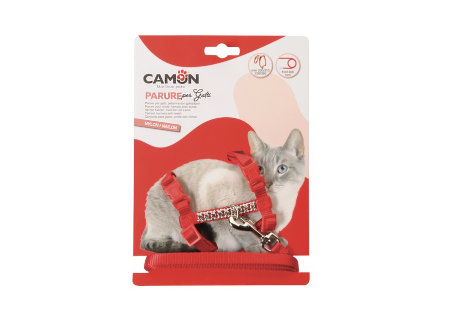 Parure per gatto guinzaglio-pettorina in nastro di nylon impreziosito con decori in strass.