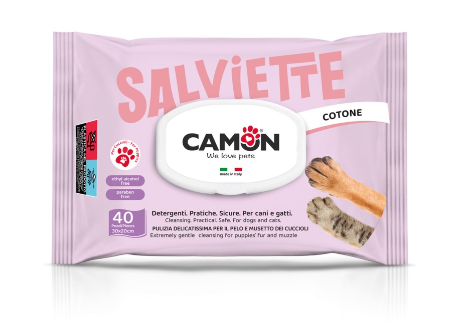 Salviette in morbido tessuto da tenere sempre a portata di mano per detergere con dolcezza la cute ed il pelo dei cuccioli.