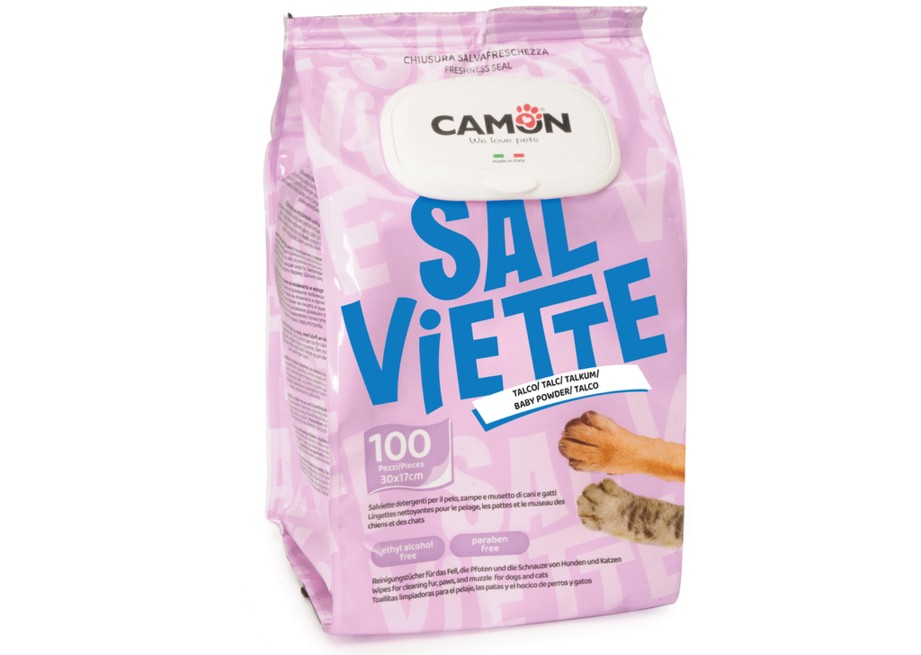 Salviette detergenti per la pulizia del pelo e del musetto, al profumo di Talco, nel maxi formato da 100 pezzi.
