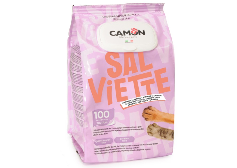Salviette detergenti per la pulizia del pelo e del musetto, al profumo di Camomilla e Lavanda, nel maxi formato da 100 pezzi.