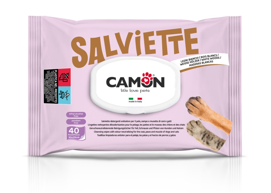 Praticissime salviette detergenti per il vostro animale domestico, da tenere sempre a portata di mano: a casa e in viaggio, per pulire il pelo e le zampe, togliere il cattivo odore, pulire il muso e le orecchie.