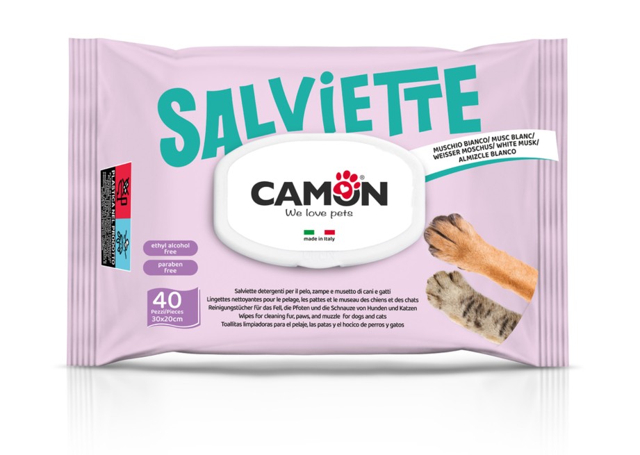 Praticissime salviette detergenti per il vostro animale domestico, da tenere sempre a portata di mano: a casa e in viaggio, per pulire il pelo e le zampe, togliere il cattivo odore, pulire il muso e le orecchie.
