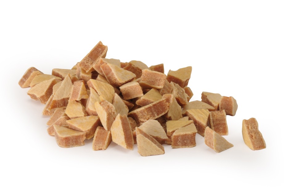 Sandwich a forma di triangolini di pollo e merluzzo, uno sfizioso alimento complementare per cani adulti.