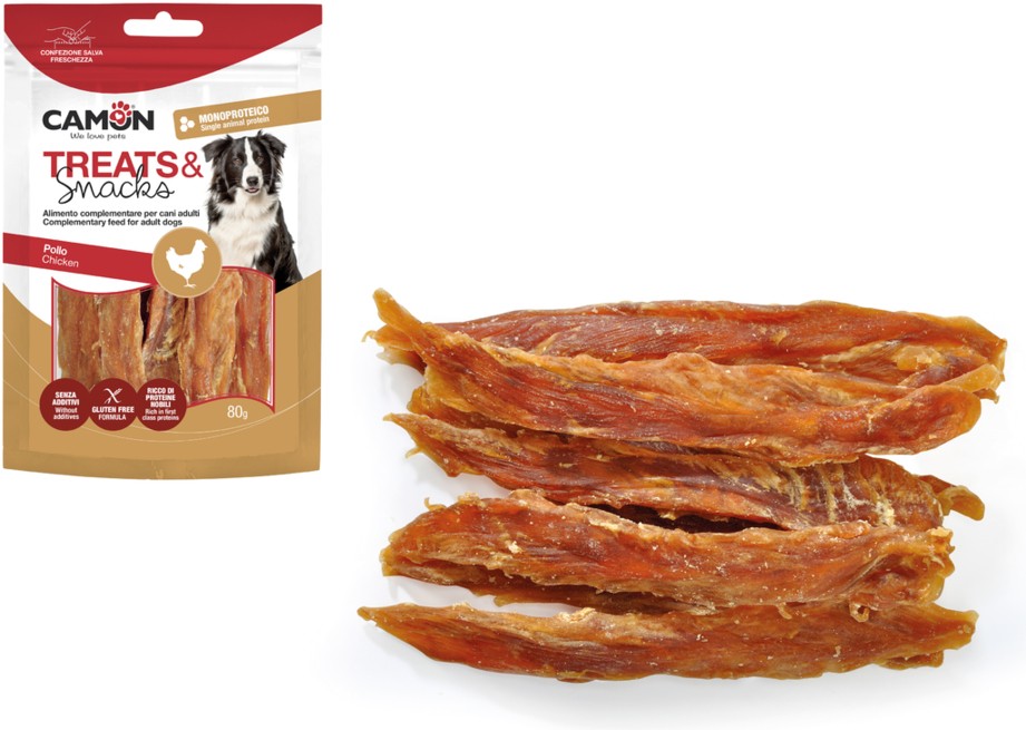 Sfiziose strisce di pollo essiccate, un utile alimento complementare masticabile per il cane.
