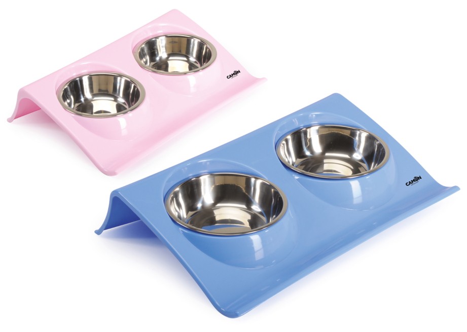 Pratico vassoio in plastica che contiene 2 ciotole in acciaio.